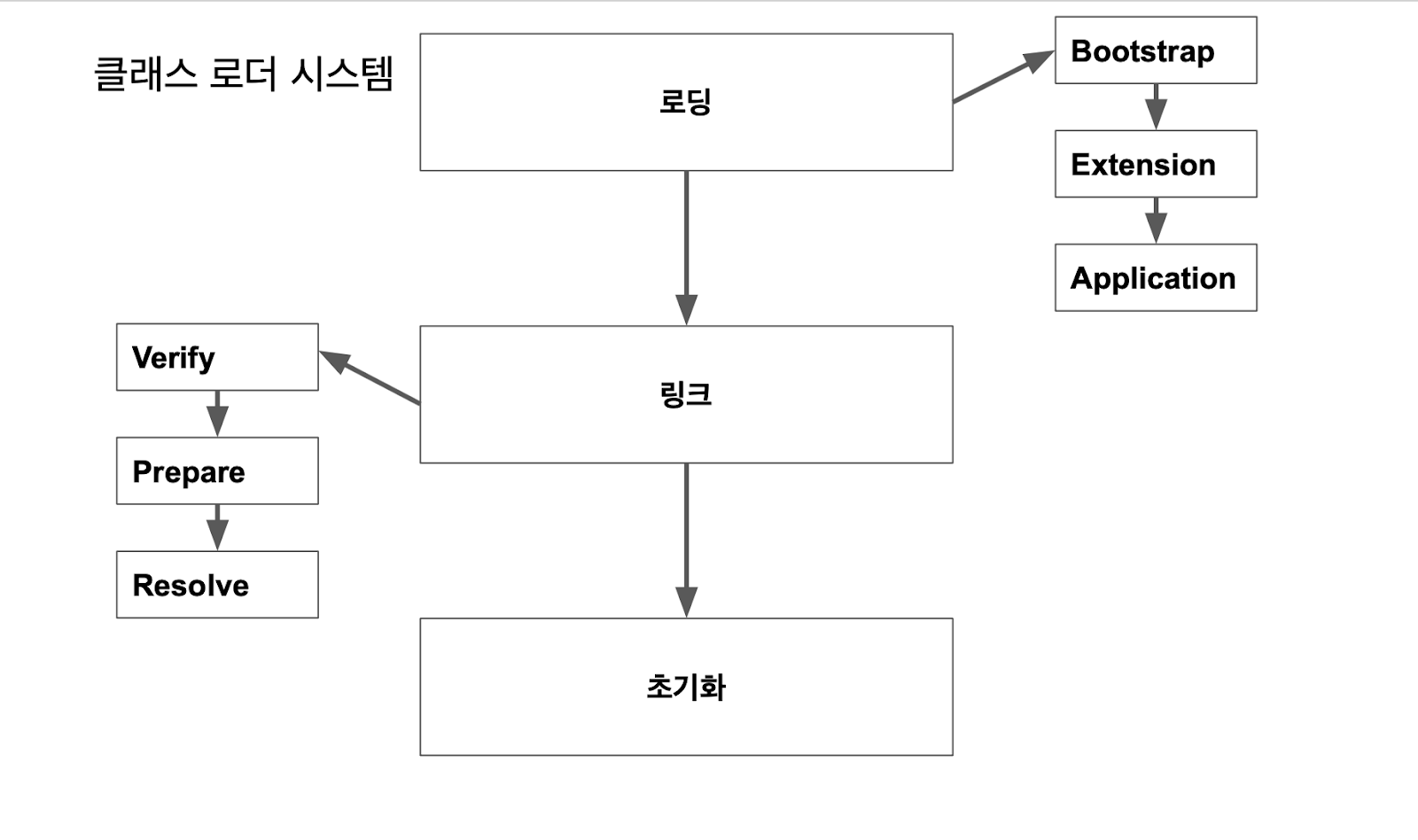 이렇게 3가지의 구조로 되어있습니다. 클래스 로더 시스템은 말 그대로, 클래스를 읽어오는 시스템 구조인데, 로딩 -> 링크 -> 초기화 순으로 진행이 됩니다.