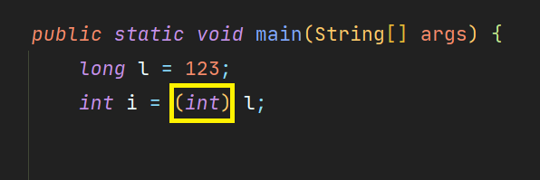 위에 5~8바이트를 전부 버려야 한다. 그러므로 캐스팅은 절대, 자바가 자동으로 진행해주지 않고, 만약 캐스팅을 한다해도, 이런 바이트가 손실되지 않는다는 확신 이 개발자가 있어야 한다. 그러면 캐스팅을 사용할 수 있다. 캐스팅을 사용하는 방법은