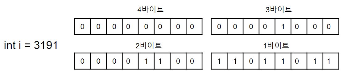 같은 ‘3191’ 이라는 정수를 int 형으로 들어갔을 때는 3바이트 까지만 쓰는 상황이다.