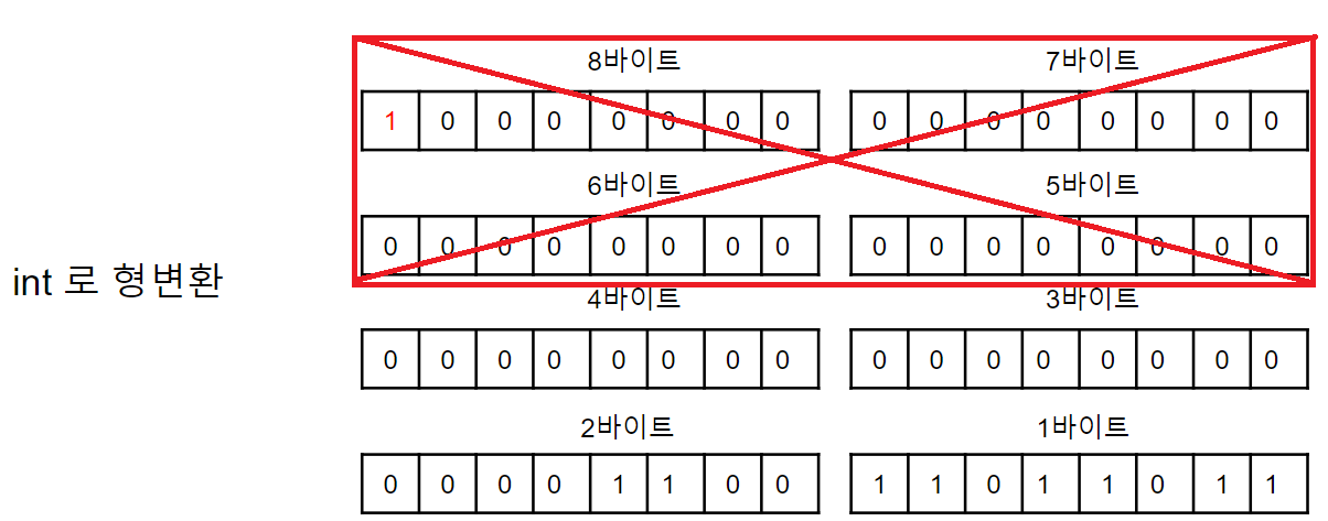 이렇게 8바이트 를 사용하고 있다고 가정하자, 그러면 이long를 int로 변경을 한다고 하면