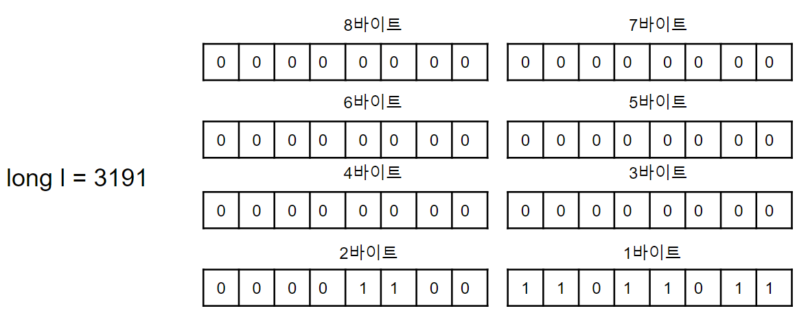 같은 ‘3191’ 이라는 정수를 int 형으로 들어갔을 때는 3바이트 까지만 쓰는 상황이다.