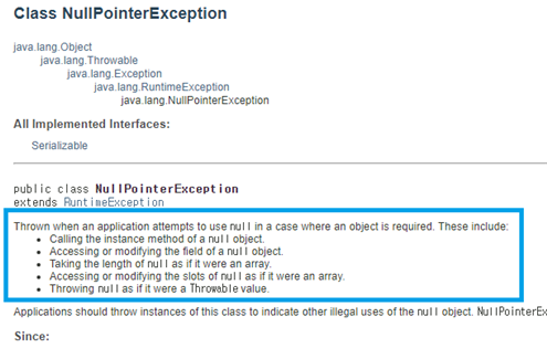 Java NullPointerException API 문서 해석해 보자면 다음과 같다.