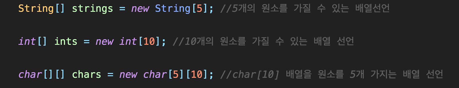배열을 선언하고 사용하는 방법은 너무 많은데, 일단 여기서 끝내고 자바가 아나라 배열만 가지고 사용하는 법에 대해서 알아보도록 하자 다음에,
