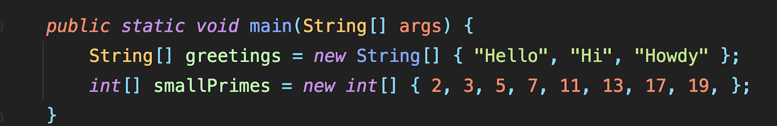 배열을 초기화 하기 위해서는 먼저, 원소 값이랑 일치하는 선에서 대괄호 [ ] 뒤에 curly braces { } 를 넣어서 값들을 집어 넣으면 가능하게 된다.