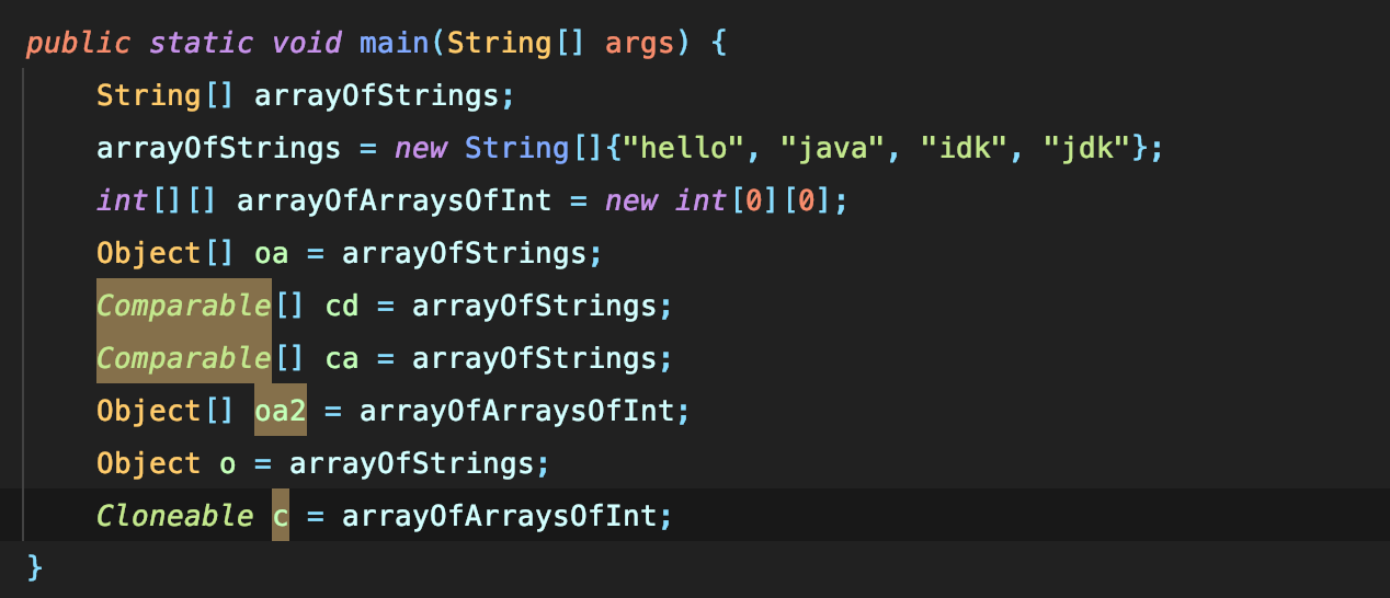 하지만, 배열의 인스턴스들은 Obejcts(객체)이다. 무슨 의미냐면, 배열은 ‘java.lang.Objects’ 에 상속 받는다. 그래서 배열은 ‘Cloneable interface’ (객체 자신의 메모리를 복사하는 Object의 인터페이스)를 implement 받는다.