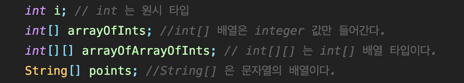 2. 배열 타입(Array Type)배열 유형은 자바 클래스와 마찬가지로 참조 타입입니다. 그래서 배열은 클래스의 인스턴스와 마찬가지로 객체이다. 클래스랑 다르게, 배열의 타입은 굳이 정의할 필요없이, 간단하게 원소 타입 뒤에 대괄호 ‘[ ]’ 붙히면 됩니다. 예를들어서 밑의 사진을 보면서 어떻게 배열을 정의하는지 확인해 보자.