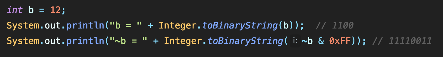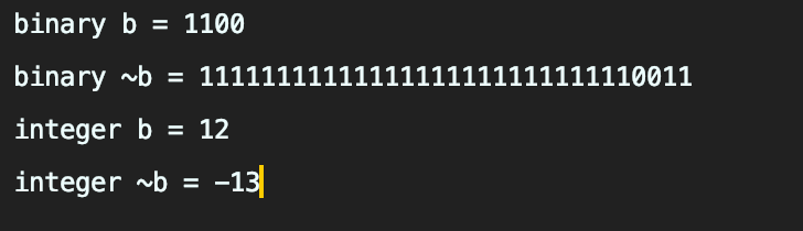 다음과 같은 연산을 한다고 했을 때, 12의 바이너리 표현은 [1 1 0 0] 인데 이를 보수 연산을 하면 [0 0 1 1] 으로 바뀌게 된다. 그래서 출력된 바이너리를 보고싶어서 Integer.toBinaryString() 메서드를 상용했는데, 보수 연산을 하여 32비트(8바이트 로 변경된다.