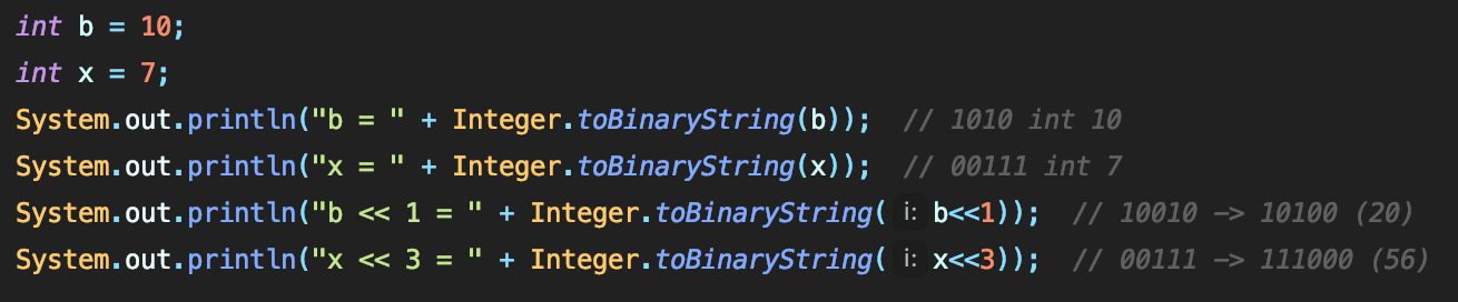 정말 간단하다 비트를 옮긴다고 생각을 하면 된다. 옮긴다보다는 “비트를 왼쪽으로 밀어버린다”라고 생각하는게 옳을 수 있다. 즉 0001 이라는 비트가 있다고 가정해보자 이를 <<1 을 한다면 1칸 밀어버려서 0010 이 된다. 그리고 <<2 를 한다고 하면 0100 이 된다.