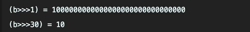 b >>> 1 = 0100 0000 0000 0000 0000 0000 0000 0000 이고 음수를 보장하지 않는다. 예를 보자