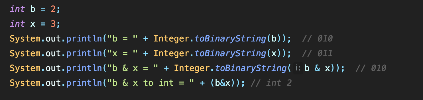 ‘And’( & ) 연산은 두개의 정수형 연산자를 각 비트의 Boolean 의 And 연산을 진행하게 된다. 아직 Boolean 에 대해서 다루지 않아서, 어려울 수 있는데, 각 비트라고 하면 0 0 0 0 의 각 0 의 비트와 연산한다고 생각하면 된다. 그리고 and 연산이라 한다면 만약 같은 자리에 1이 동시에 있다면 1을 반환한다고만 알아두도록 하자. ex) 010 & 110 이면 2번째의 1만 서로 같으므로 2번째 비트만 1을 반환한다. 그러므로 010 이 된다.