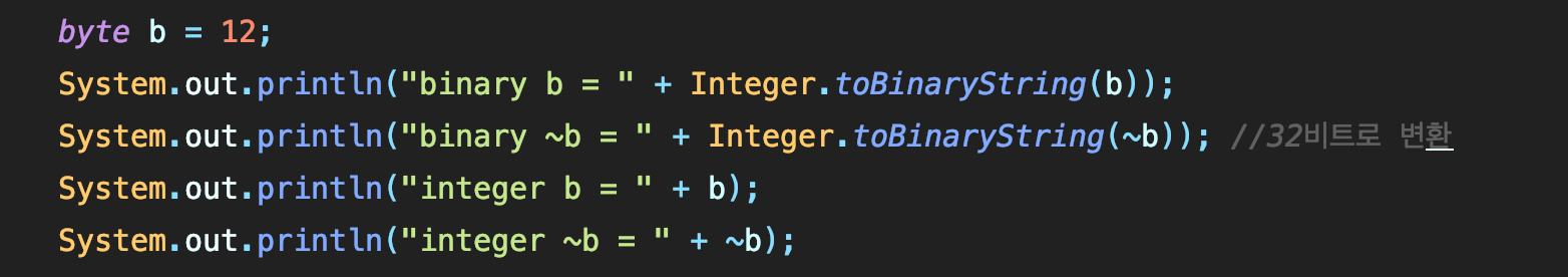 다음과 같은 연산을 한다고 했을 때, 12의 바이너리 표현은 [1 1 0 0] 인데 이를 보수 연산을 하면 [0 0 1 1] 으로 바뀌게 된다. 그래서 출력된 바이너리를 보고싶어서 Integer.toBinaryString() 메서드를 상용했는데, 보수 연산을 하여 32비트(8바이트 로 변경된다.