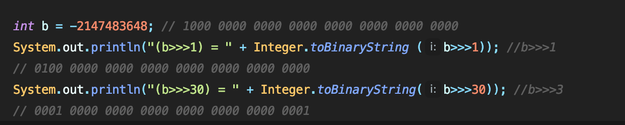 b = 1000 0000 0000 0000 0000 0000 0000 0000 을 가지고 있다. 이걸 >>>1 만큼 오른쪽으로 민다고 가정하면