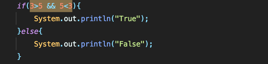 마지막으로 && 연산자는 조건부 AND 연산자라고 한다. 조건부 라고 불리는 이유는, 두번째 피연산자의 결과 값에 따라, 평가하기 때문인데, 예를 하나 들어보자 만약 첫번째 피연산자가 False 를 반환한다고 가정해보자, 그러면 연산은 두번째 조건부에 상관도 없이 무조건 False를 반환한다 이는, 성능면에서 이점을 얻을 수 있다. 왜냐면 (A<B)&&(C>D) 라는 식이 있다고 가정하자 JVM에서 인터프리터는 A<B가 False를 리턴하면 C>D 를 연산할 필요도 없기 때문에, 그냥 넘어가게 되고, 한줄 한줄 읽어야 하는 인터프리터 입장에서는 부담을 덜 수 있는 것이다. 밑의 식을 보면 3>5 는 무조건 False이기 때문에 뒤에 5<3을 진행하지 않는다.