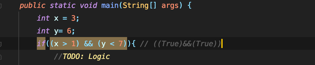 && 연산자(정확히 ‘!’ 를 제외한 다른 논리연산자) 는 관계 연산자보다 우선순위가 낮다. 그러므로 실제로 먼저 수행이 되는건 관계 연산자 - > 논리 연산자 이긴 하다. 그러므로 위의 조건문은 정확하게 맞는 표현이긴 하다. 하지만 몇 개발자 분들은 좀 더 조건문을 명확하게 인지하고 싶기 때문에 parentheses(괄호) 를 붙히고는 한다.