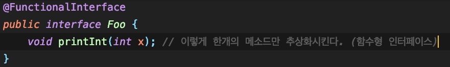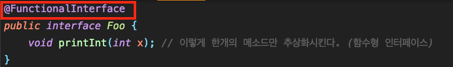 다음과 같이 @FunctionalInterface 를 어노테이션에 붙히면 실질적으로 interface에는 추상 메소드 하나만 정의할 수 있다. 만약 2개를 정의하려 한다면,