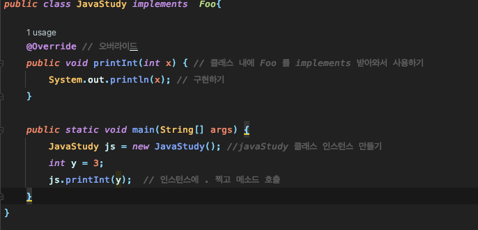 여기서 interface에 정의된 printInt를 사용할 수 없다. 왜냐면 구현을 하지않고