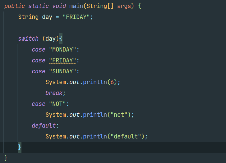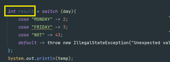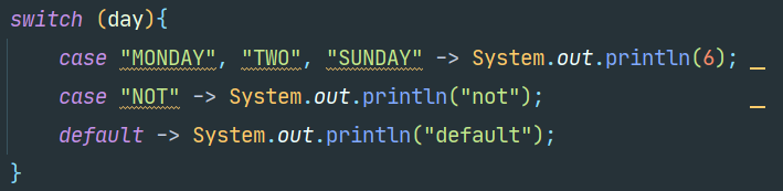 두번째로는 multi case Label이다. 원래 저렇게 Mon, Two, Sun 3개를 해줄 수 없는데, 12 이후로는 저렇게 3가지의 조건을 걸어줄 수 있다는 단점이 있다. 벌써 case 문을 작성할게 확 줄어들었다.