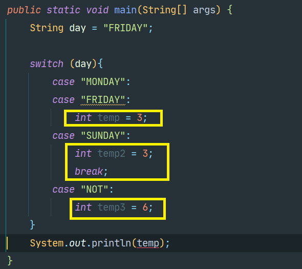 이런식으로 case 문 안에 선언하면, brace가 끝나면 case 안에 temp변수는 죽기 때문에 이 것도 좋은 방법이라고 할 수 없다. 그렇다고 변수를 외부에 선언을 하면,