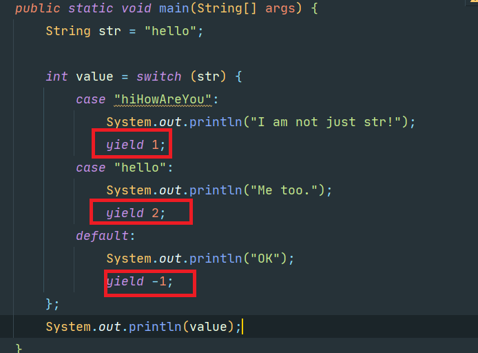 자료가 정말 없어서 jdk로만 보다보니 좀 다를 수 있지만 일단 yield 라는 산출값을 리턴이 가능하다. 예전에는 break를 통해서 했는데 yield를 사용하여 변수 에 값을 넣을 수 있다.