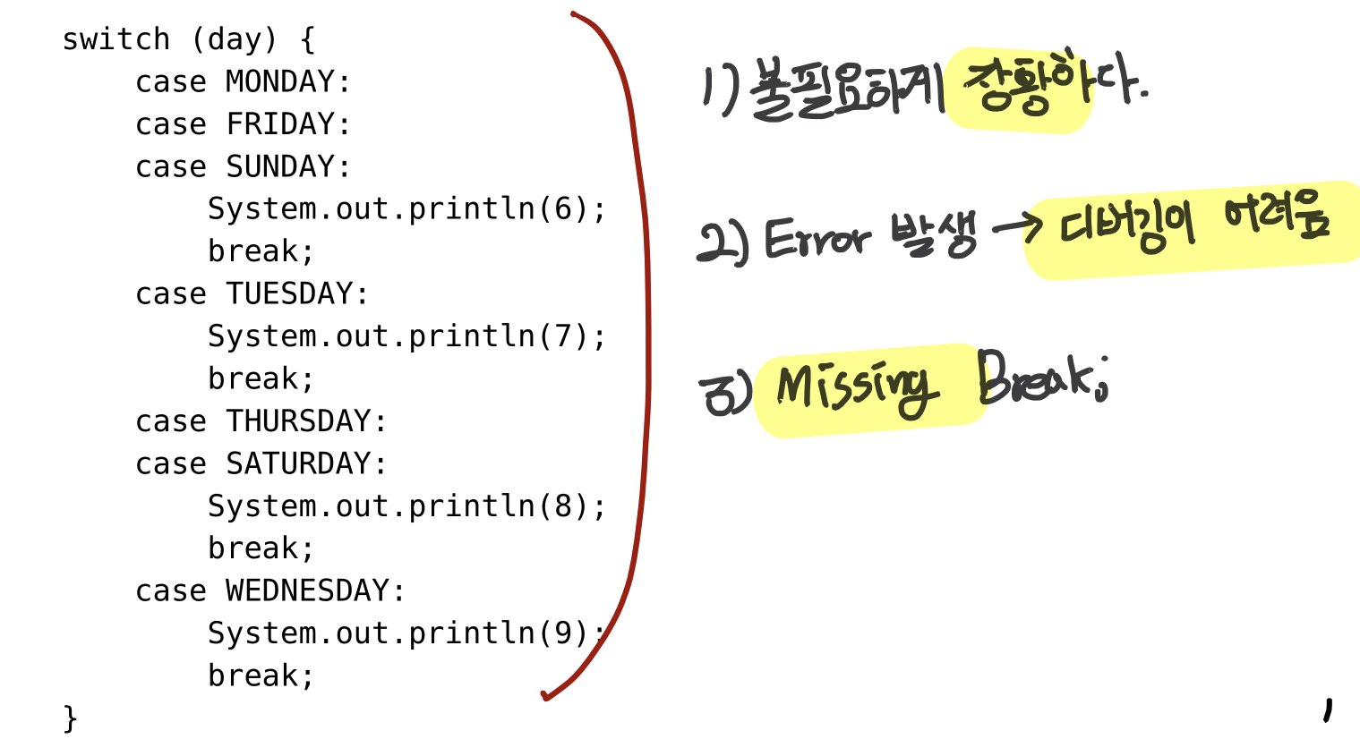 이런 코드의 문제점은 무엇일까? 사실 문제점이라고 하기는 그렇다. 자바가 switch case 문을 만들었을 때, C와 C++에 밀접하게 연결하여 만들었고, 이런 코드가 사실 문제가 될 건 없다고 생각한다. 적어도 아직 초보개발자인 나에게는 말이다 : )