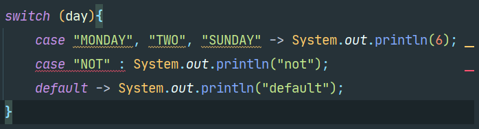 두번째로는 multi case Label이다. 원래 저렇게 Mon, Two, Sun 3개를 해줄 수 없는데, 12 이후로는 저렇게 3가지의 조건을 걸어줄 수 있다는 단점이 있다. 벌써 case 문을 작성할게 확 줄어들었다.