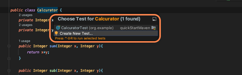 Create new test 를 누르면, Test 코드를 작성할 수 있는 클래스 코드가 작성된다. 파일 이름은 클래스명 + Test 가 된다.