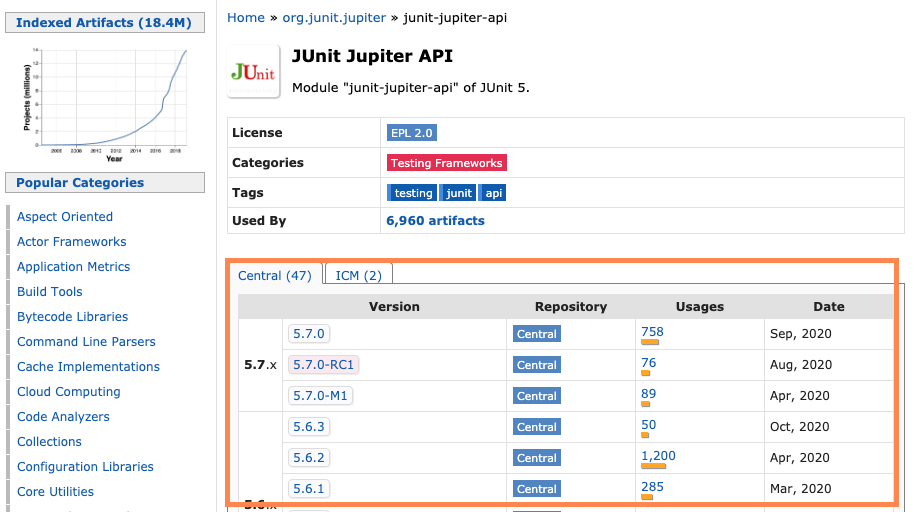 maven repository 에 들어가서 junit 을 들어간다. maven repository 에는 수많은 (우리가 사용하는) 의존성을 추가할기 쉽게 검색을 해서, 코드를 집어넣을 수 있으니 기억하자