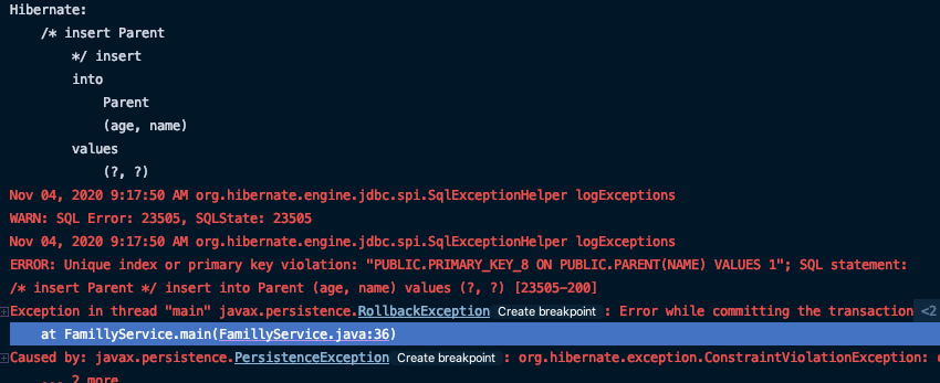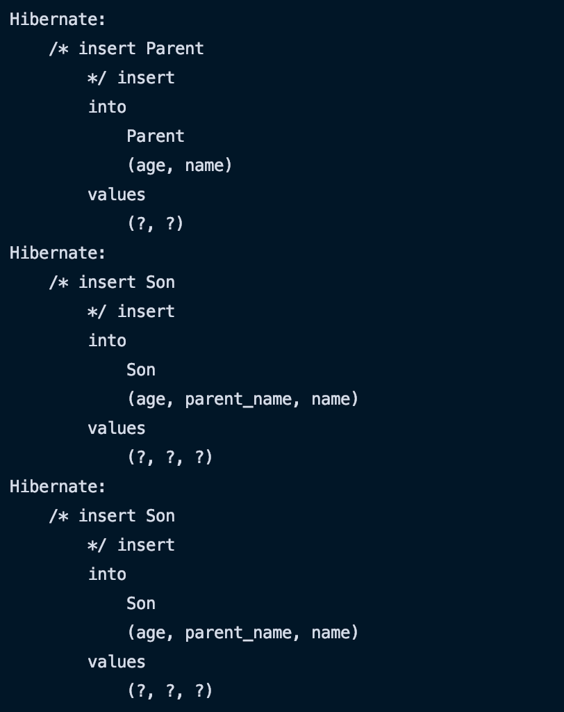 EntityManagerFactory emf = Persistence.createEntityManagerFactory("hello"); EntityManager em = emf.createEntityManager(); EntityTransaction tx = em.getTransaction(); tx.begin(); Parent parent = new Parent(); parent.setName("엄마"); Son son1 = new Son(); Son son2 = new Son(); son1.setName("아들1"); son1.setAge(11); son1.setParent(parent); parent.setSon(son1); son2.setName("아들2"); son2.setAge(10); son2.setParent(parent); em.persist(parent); em.persist(son1); em.persist(son2); tx.commit(); em.close(); emf.close();}