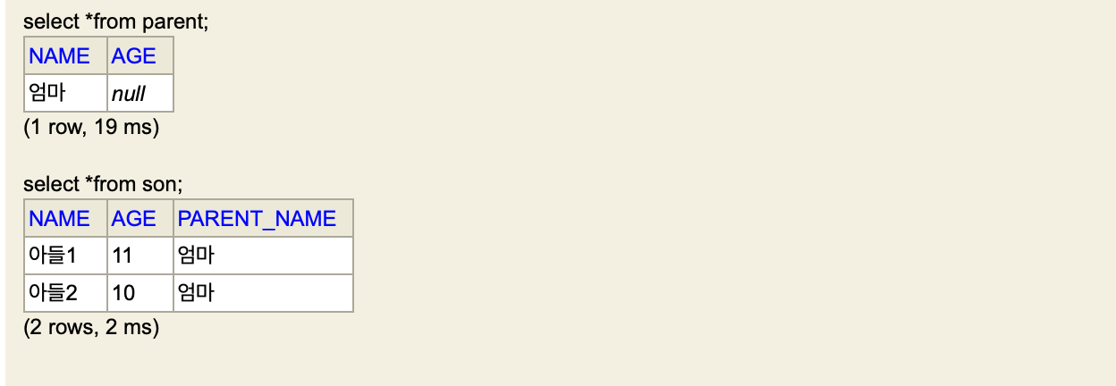 @Entity @Table public class Parent { @Id @Column private String name; @Column private Integer age; @OneToOne(mappedBy = "parent") @JoinColumn private Son son; }3. 구동결과