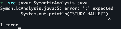 자 터미널로 직접 만든 java 파일이다. 출력 부문에서, ‘세미콜론’( ; ) 하나가 빠져있는데, 이를 컴파일 시키면