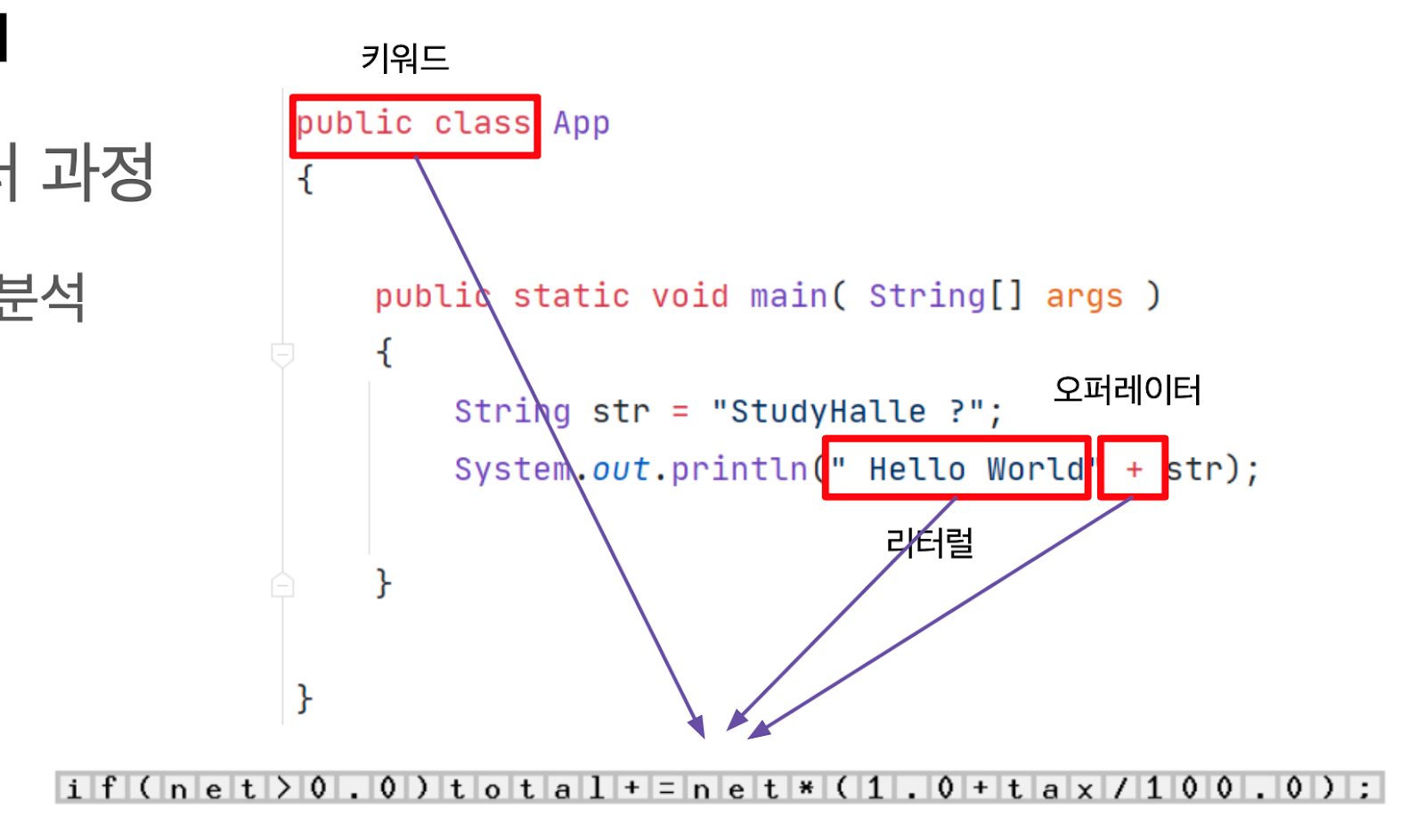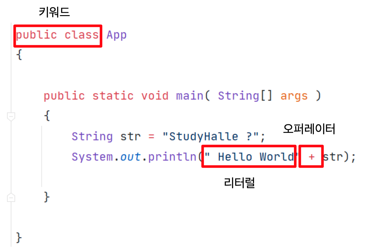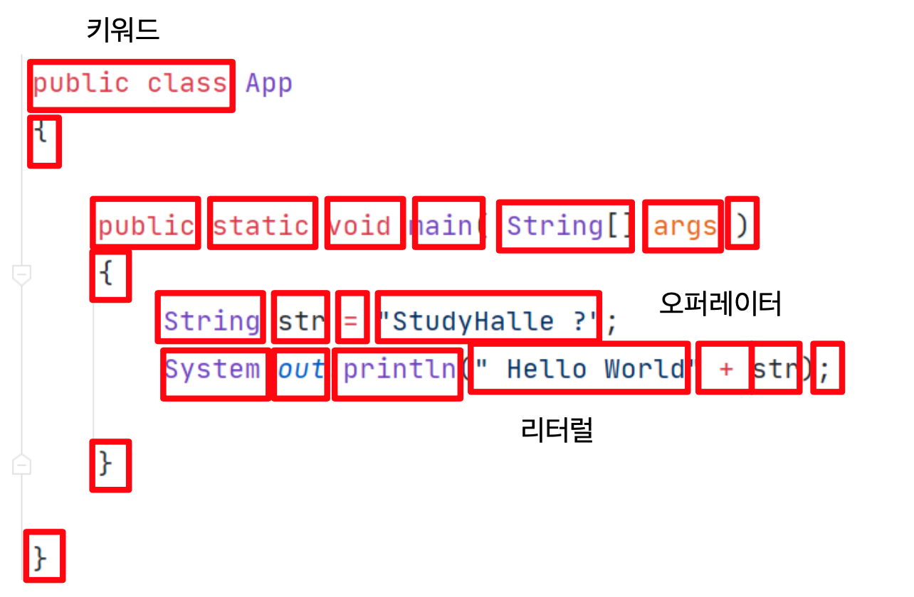 사진에 보이는, public, class 와 같은 키워드, “Hello World”같은 리터럴, 그리고 연산자인 + 와 같은 오퍼레이터들을 수집한다. 이런 키워드, 연산자, 리터럴을 '어휘소' 라고 하는데, 모두 수집하면,