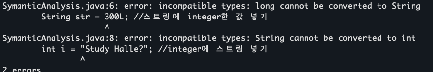 이런 에러는 의미분석 과정에서 발생하게 된다. 이 과정이 모두 끝나면 마지막으로 중간 코드를 생성하게 된다.