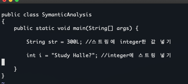 말 그대로 의미가 맞는지를 검사하게 된다. 구문분석에서 오류없이 잘 통과가 됬으면,의미 분석에서는 대표적으로 타입 검사 , 자동 타입 변환 같은걸 진행하게 된다. 구문분석에서 에러는 못잡았지만, 여기서 잡히게 된다 만약 String 에 integer값을 입력하게 되면, 구문분석이 아니라, 의미분석에서 에러가 발생한다.