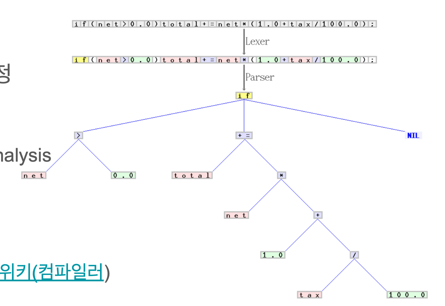 확실히 어려운 단어들이 보이는데, 이런 분석과 과정은 컴퓨터 공학 “컴파일러” 과목에서 간간히 나오는데, 간단하게 짚고 넘어가보도록 하자. (재밌는 부분이 많다)