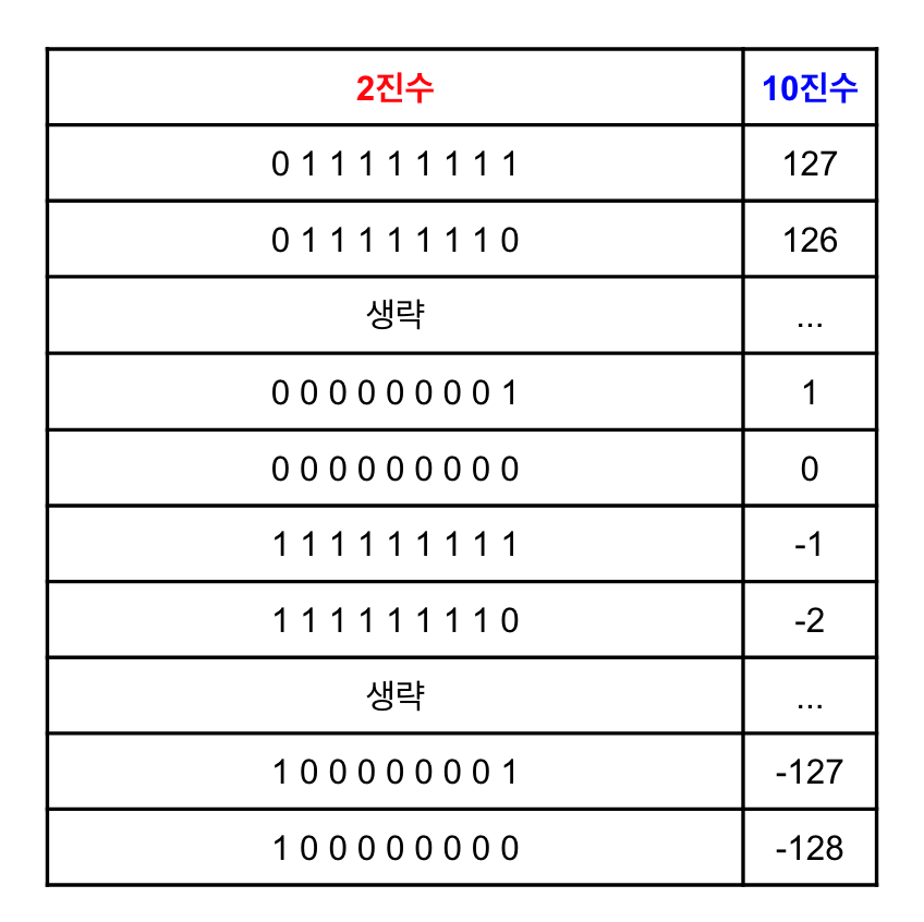 -128에서 127인데, 왜 음수의 절대값은 128이고 양수의 절대값은 127일까? 그건 0때문에 양의정수에서 하나를 뺏기 때문이다. : )
