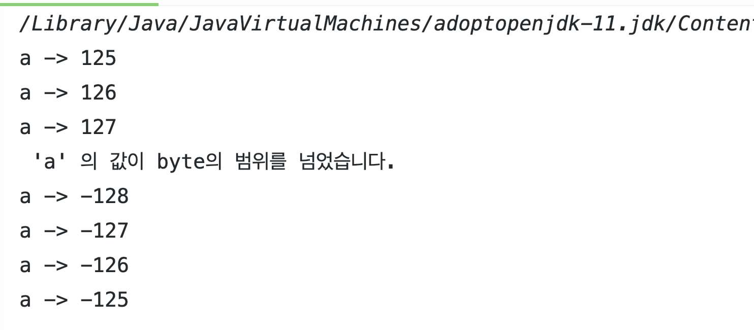 그럼 만약 byte 변수에 있는 값이 동적으로 변경되다가, 저장할 수 있는 값을 초과되면 어떻게 될까? 궁금해 졌다. 만약 중간에 범위를 넘어가게 되면 제일 하위 값인 -128로 변경이 된다.