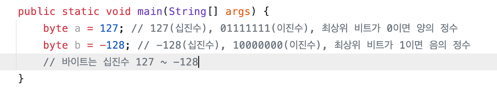 byte는 1byte의 메모리를 저장 할 수 있는데 이 값은 -2^7 ~ (2^7 - 1) 이다. 10진수로 나타내면