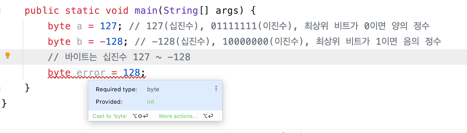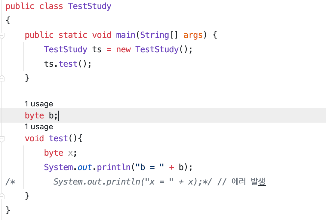 추가적으로 만약, byte 변수를 선언하고, 아무런 값을 넣지 않는다면 어떻게 될까? 이는 컴파일 에러가 발생한다. byte 의 기본 값은 0 이다. 근데 byte a 를 선언하고, 출력하면 a = 0 이 나와야 하는데 컴파일 에러가 발생한다.