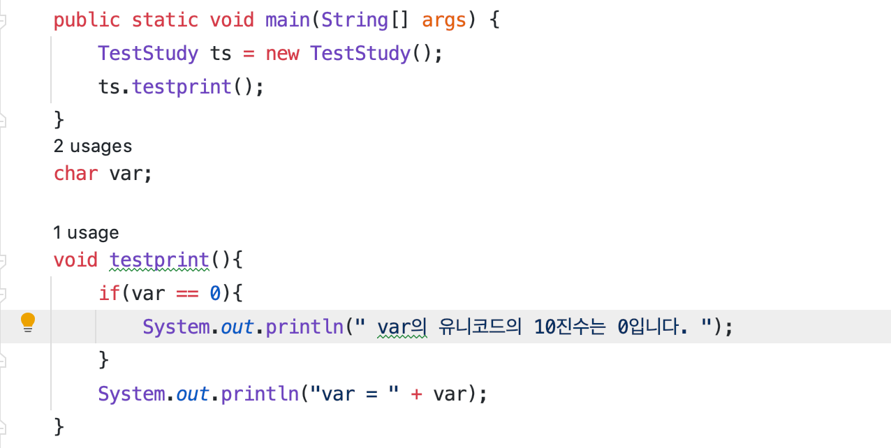 char의 기본값은 무엇일까 16진로는 \u0000 이고 10진수로는 0으로 기본값이 설정 되어있다.
