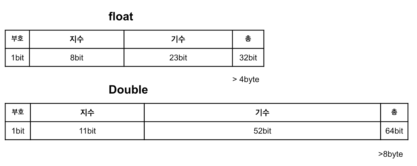 float은 4바이트가 double 형은 8바이트로 구성되어있다. 구성되어있다는 말이 무슨 말이냐면,