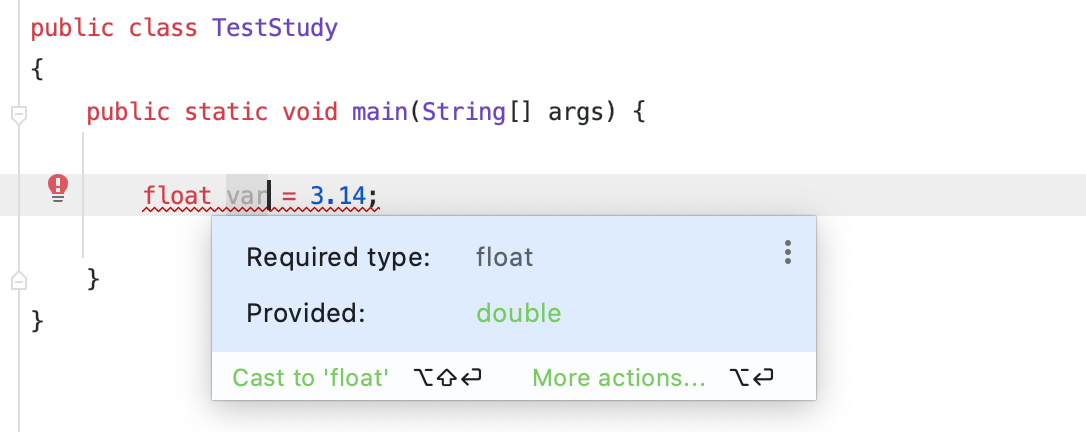 이렇게 자바에서 실수를 기본적으로 double을 인식하게된다. 흠.. 의문이 들기는 한다. 왜 그런걸까 심지어 일관성있게, long보다 더 작은 int를 선택하고, 정수는 왜 float보다 더 큰 double을 택하는 걸까? 이 부분에 의문점이 드는데, 이는 나중에 알아보도록 하자. 아니면 c언어에서 사람들이 int를 더 많이 사용하고, Double을 더 많이 사용하는 ‘관례' 때문일 수도 있겠다.