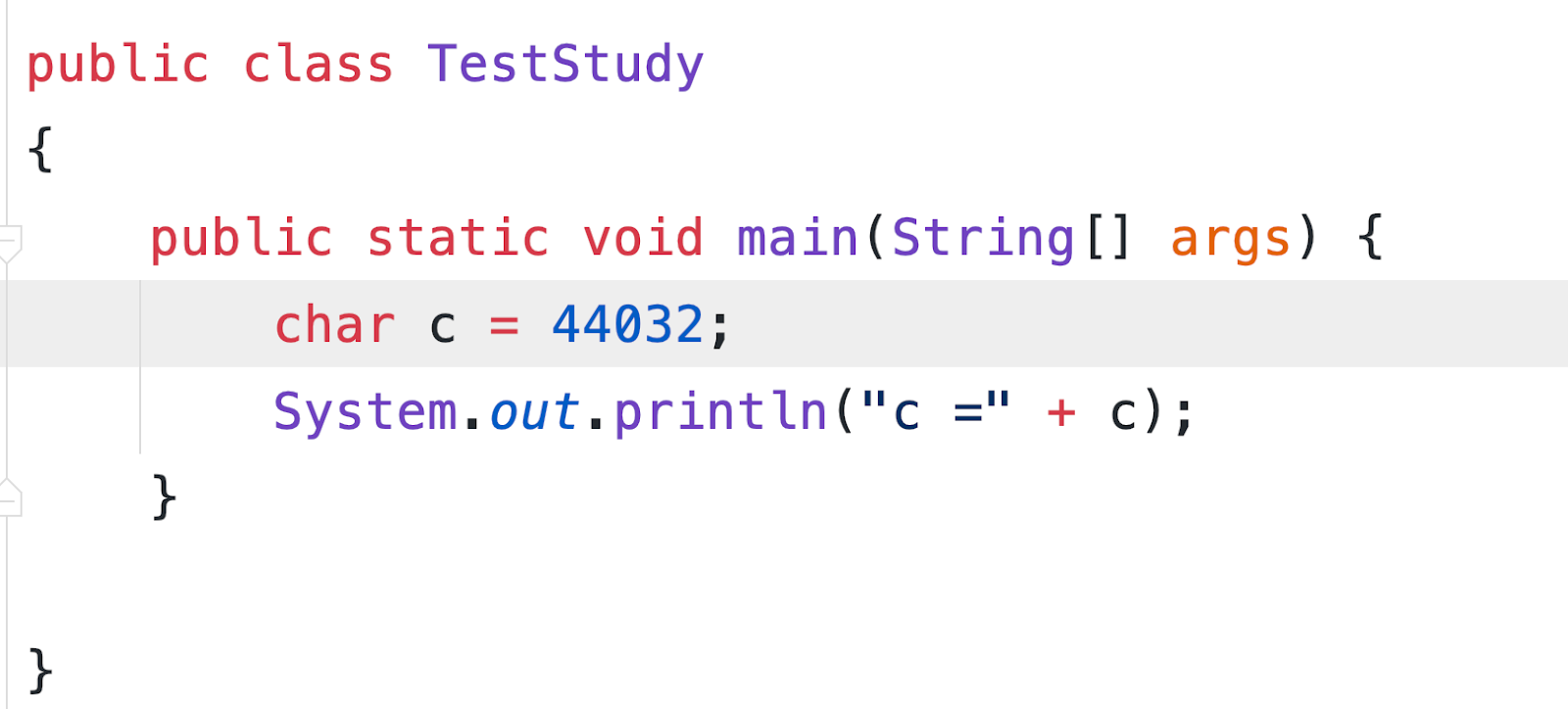 char형을 사용하는 방법은 다양한데, 만약에 내가 10진수의 유니코드를 알고 있다면, 문자로 변경할 수 도 있다. 예를들어서 한글 ‘가'의 44032의 유니코드를 가지고 있다.
